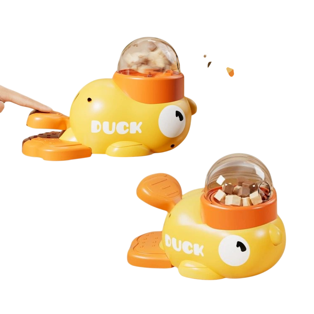 Funciona como un dispensador interactivo: al presionar la aleta, el juguete expulsa pequeñas golosinas o balanceado, estimulando el movimiento, la curiosidad y el juego activo de tu mascota.
