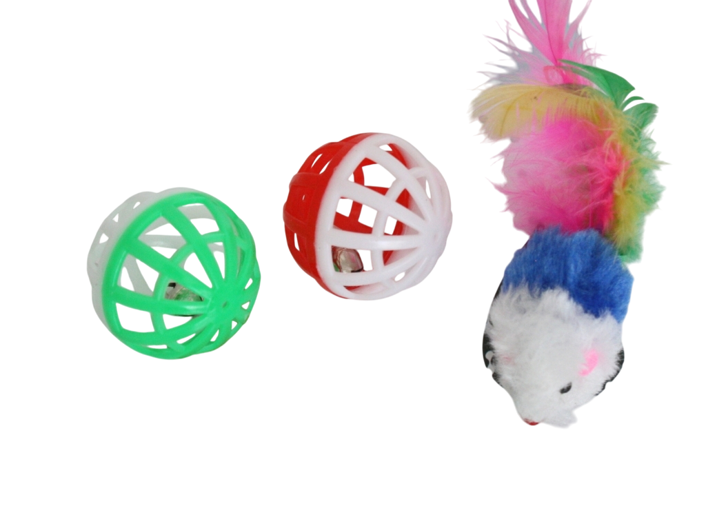Incluye dos pelotas plásticas con cascabel en colores variados 🎨 y un ratón de peluche con plumas multicolor, ideal para horas de juego y entretenimiento.