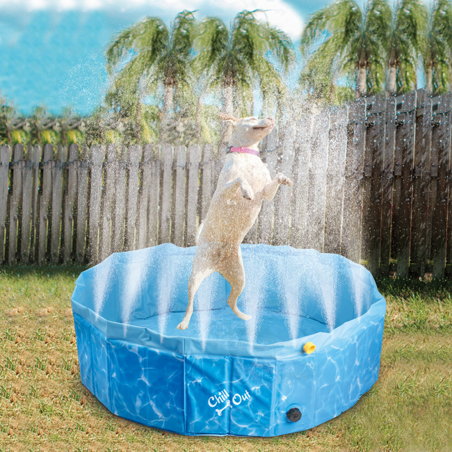 La pileta rociadora Chill Out 2 en 1 combina lo mejor de una pileta y una alfombra rociadora, ofreciendo a tu mascota una experiencia refrescante durante los días calurosos.