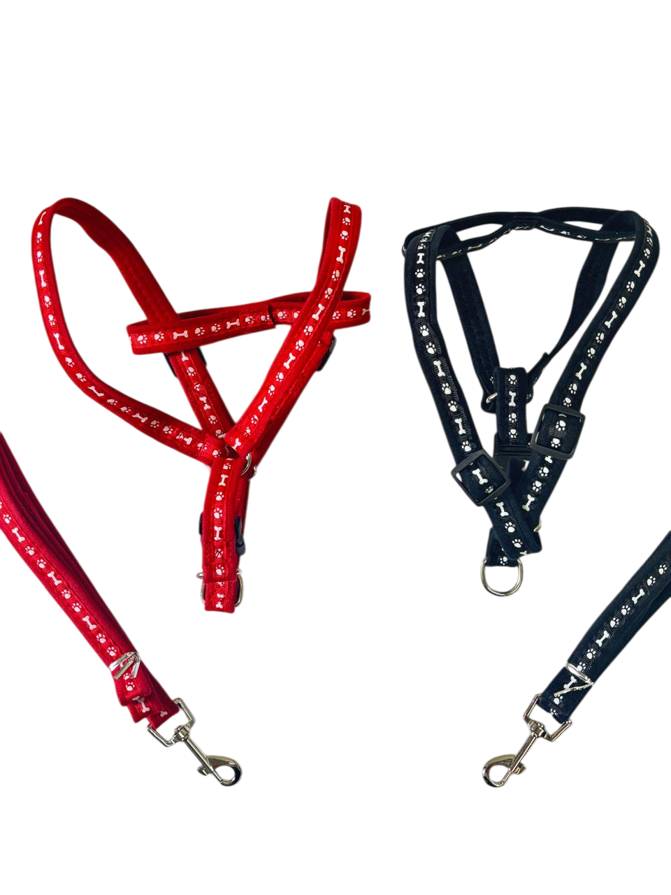 Este pretal con correa incluida destaca por su divertido diseño con huella y hueso. Fabricado con materiales resistentes, suaves al tacto y con costuras reforzadas, ideal para el uso diario.