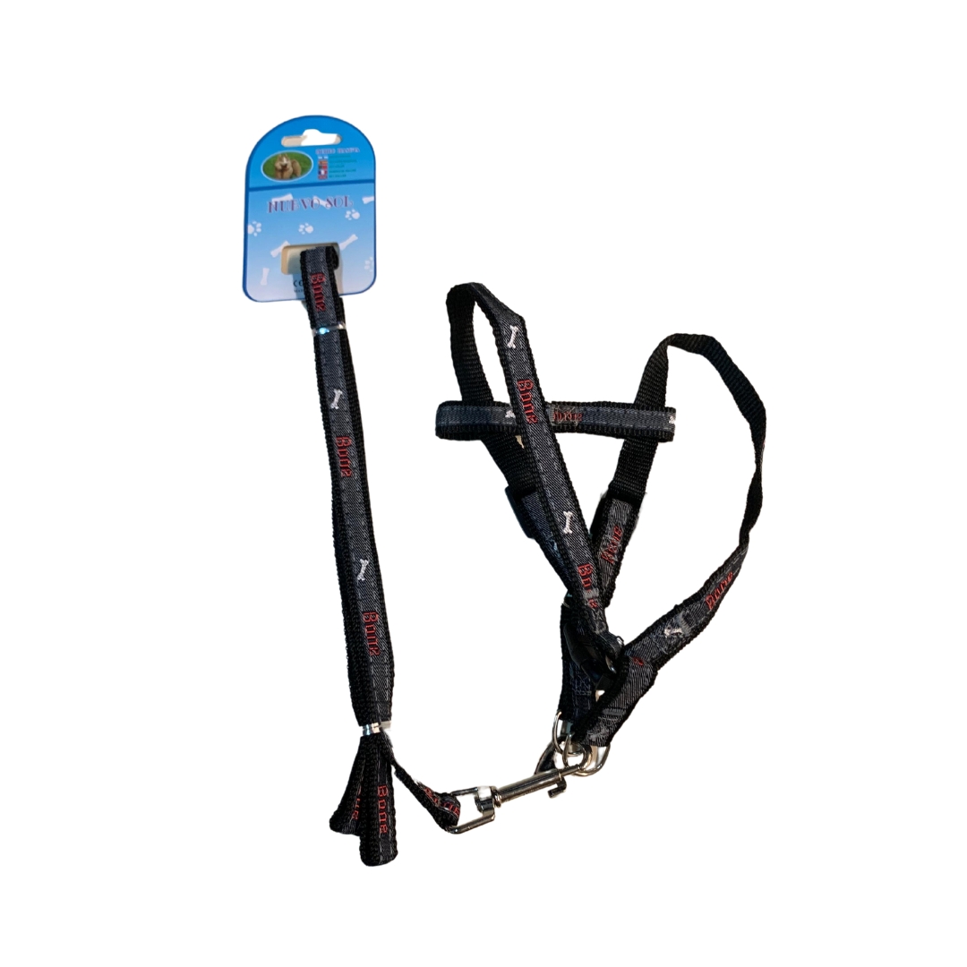 Llevá a tu perro a pasear con estilo y seguridad con este práctico pretal de jean con correa estampado de hueso.